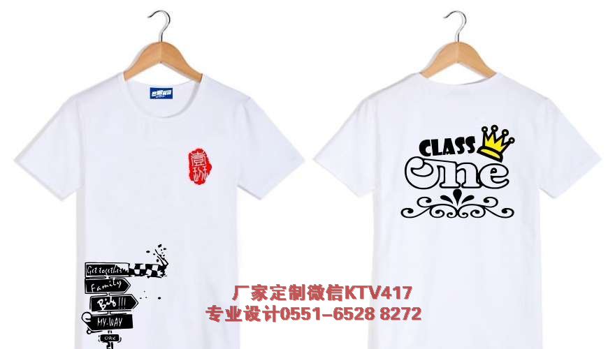班服圖片一班,采用的是白色的圓領文化衫,左胸設計成印章,鏤空顯示壹班,下面是放的是方向指示牌,后面是圖形ONE CLASS皇冠。