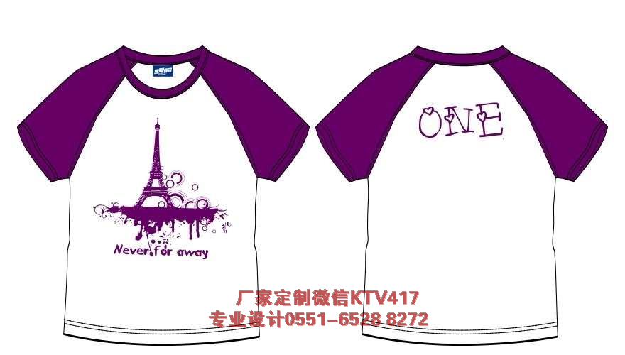上面這款壹班班服采用的是紫色插肩袖文化衫,前面的圖案是巴黎鐵塔,下面題字是NEVER FOR AWAY.后面的班服圖案是ONE組成的圖案,即是數字又是圖案,設計的很巧妙。