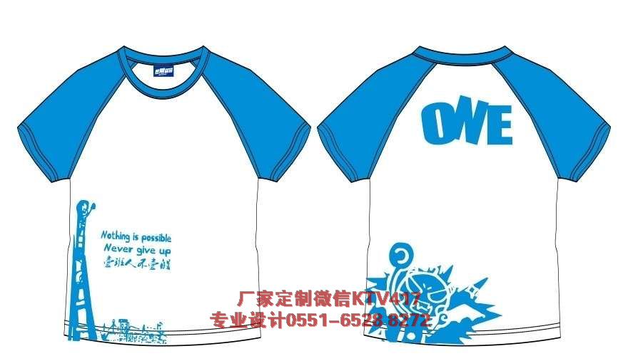 壹班圖案,采用的是藍色插肩袖圓領T恤,前印沒什么不可能,壹班人不一般,后面是卡通人物頭像。白色的底衫,印刷藍色的字很好看。