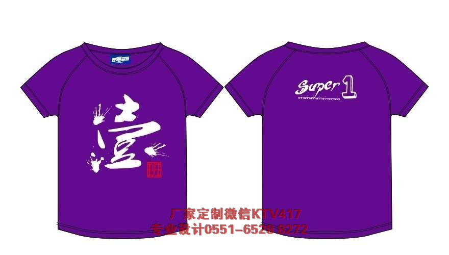 一班班級文化衫圖案紫色圓領文化衫,前面印大寫的壹,后面是SUPER1