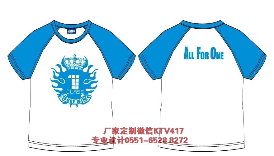 藍色一班班級文化衫圖案,CLSS ONE,后面寫ALL FOR ONE,采用的是藍色圓領T恤,很清爽。。