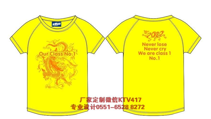 1班班徽采用的是OUR CLASS NO.1大面積的中國龍覆蓋前面,黃色的文化衫,印刷紅色額龍,有種龍袍的感覺,后面是NEVER LOSE NEVER CRY WE ARE CLASS 1 NO.1!
