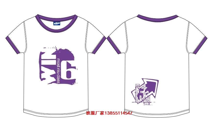 6班班服圖片,此款6班班服采用的是圓領短袖鑲邊文化衫,前面印刷6班圖案,圖案采用鏤空的工藝,鏤空出數字6.班服后面印刷大寫數字陸。