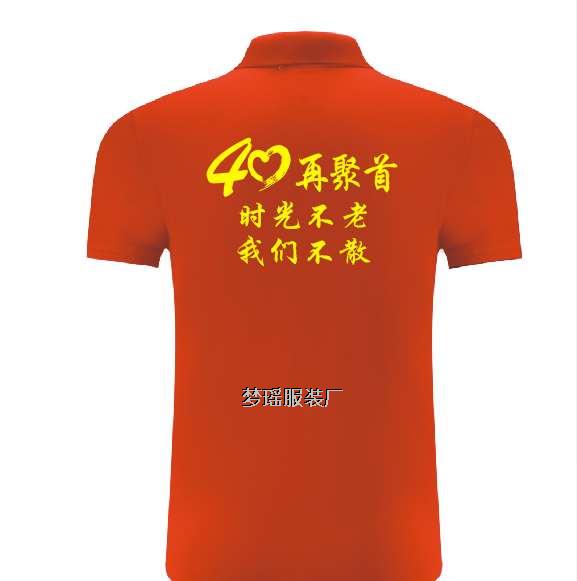 同學聚會T恤衫印字40年圖案,同學聚會T恤衫印字標語口號,由于是40年聚會,很多人想喜慶點,同學們一致選用紅色的翻領T恤衫,這款圖案是我廠給馬鞍山某個中學同學會設計的真實案例,T恤衫是左胸印刷XX中學78屆,畢業40年同學會,1982-2022,T恤衫的后背是40再聚首,時光不老,我們不散。紅色的T恤衫印刷黃色的圖案,拍照很好看,發朋友圈也不錯!事實證明,我廠設計的圖案,在聚會活動中,添磚加瓦,為同學們聚會留念,綻放光彩!