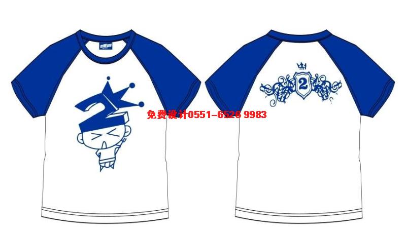 寶藍色圓領插肩袖班服,采用數字2上帶皇冠,下面是卡通人物,代表2班都奪冠!后面的圖案是花朵2,臂章的感覺。