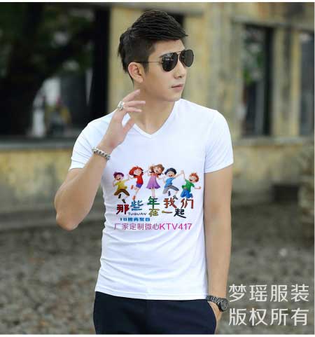 紀念衫上面是5個手拉手快樂小人,代表同學們瘋狂狂歡同學會,最下面是5班再聚首,一句話道出聚會主題。再聚首。