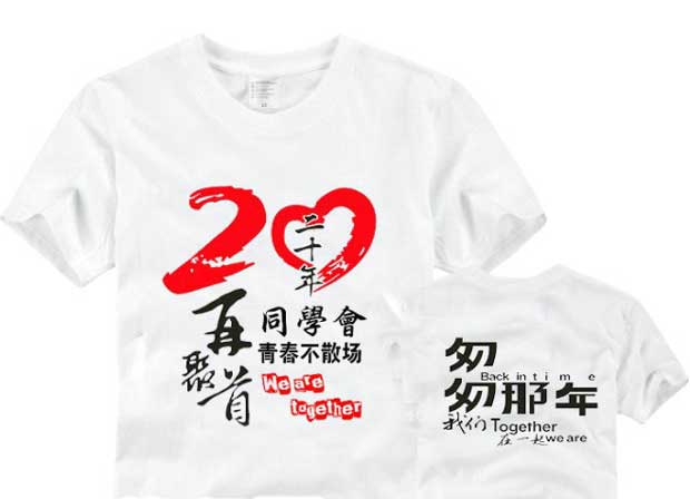 通常文化衫印字內容為:“青春不散場,時光不老,我們不散,致青春,20年再聚首,30年再相聚等等”具體用什么字體好看,用什么顏色高雅,可以由我廠設計師免費為你設計,針對我廠客戶免費設計,設計師一對一服務于您。高效溝通,極速出圖。隔行如隔山,專門的業務要交給專門的人做!不要讓自己的魯莽行事,造成同學會永久的遺憾。