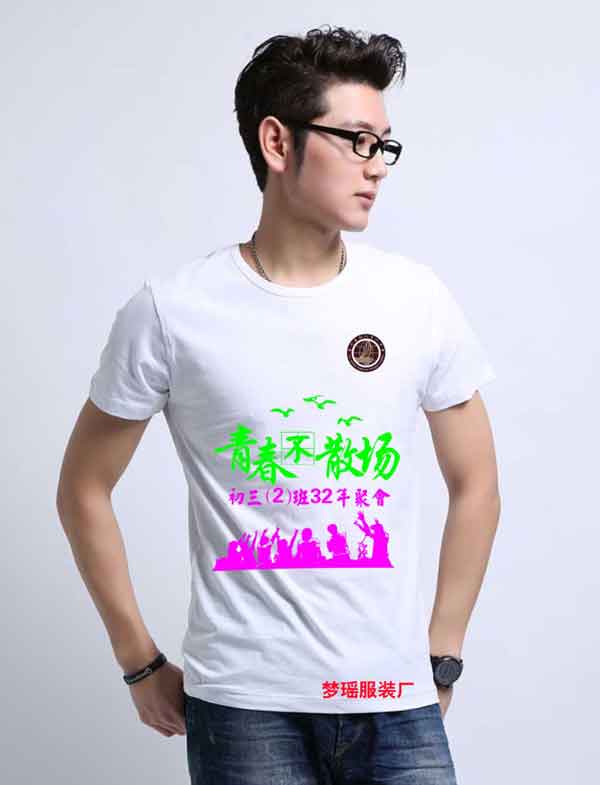 這款聚會紀念T恤圖案設計理念為,圖案上面是歡快元素,下面是愉悅聚會元素。這款紀念T恤設計圖采用的是圓領短袖純白全棉T恤為底衫,設計圖正面圖案為綠色和紫色相間,上面的半截圖案為綠色,設計圖案下面的半截為紫色。上面的圖案有時光標志元素海鷗,飛翔的海鷗,三三兩兩的海鷗,寓意時光飛逝。設計圖下面是青春不散場5個綠色的字,采用藝術字體緊湊變形排列。田字格里著重寫上“不”,暗示青春不散場!設計圖案中間是聚會班級“初三2班32年聚會”,一句話點明聚會班級是2班。聚會年限是32周年。聚會紀念T恤設計最上面是圓形;,圖案的最下面是聚會歡呼的同學們,類似酒吧氣氛,音樂歡快,同學們興奮。一起聚會,一起HAPPY!