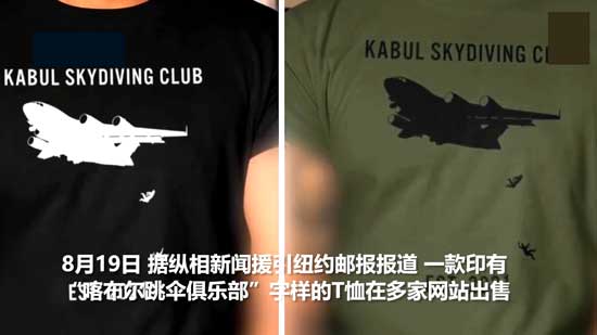 19日,據紐約郵報報道,一款印有“喀布爾跳傘俱樂部”字樣的T恤在多家網站出售。多人向銷售該T恤的網站發出投訴,目前已有網站刪除該商品目前,該公司官網還未下架T恤,但刪除了上述商品描述信息.