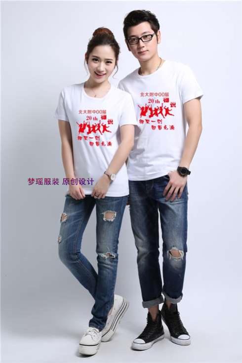 圓領素色做的衣服同學們做的最多,簡單大方,簡潔端正。一般都是白色的衣服,紅色衣服,白色的衣服同學們穿著顯白,年齡大的穿著也顯年輕,印字明顯。紅色對國人來說,是喜慶的顏色,可活躍現場聚會氣氛,紅紅火火,俗稱中國紅。紅衣服印刷黃色的圖案,很喜慶。聚會本身就是一件喜慶的事。